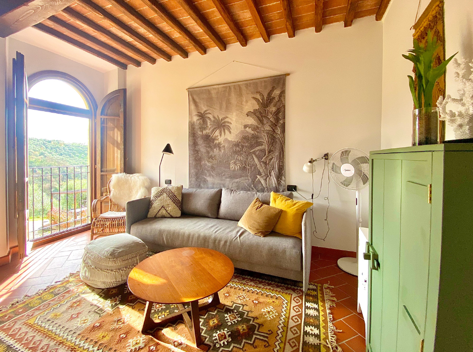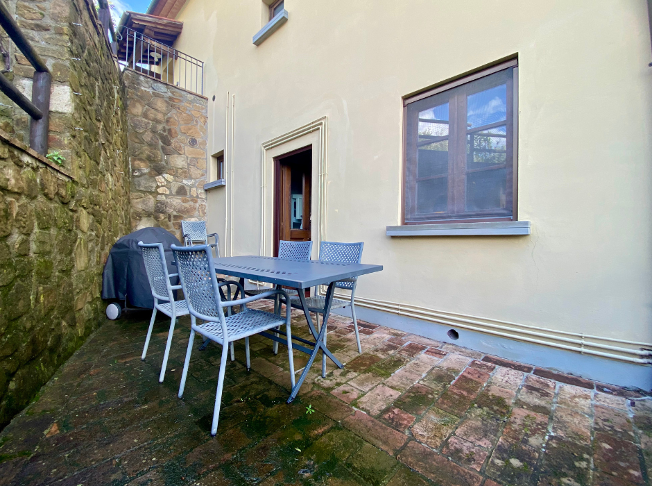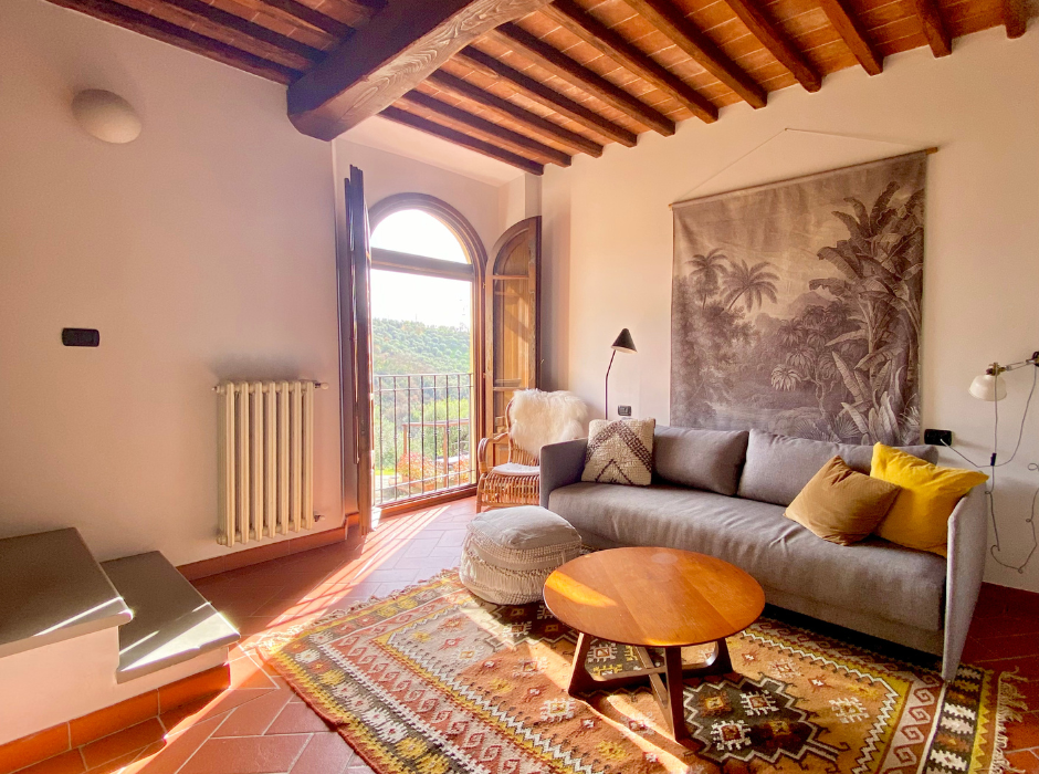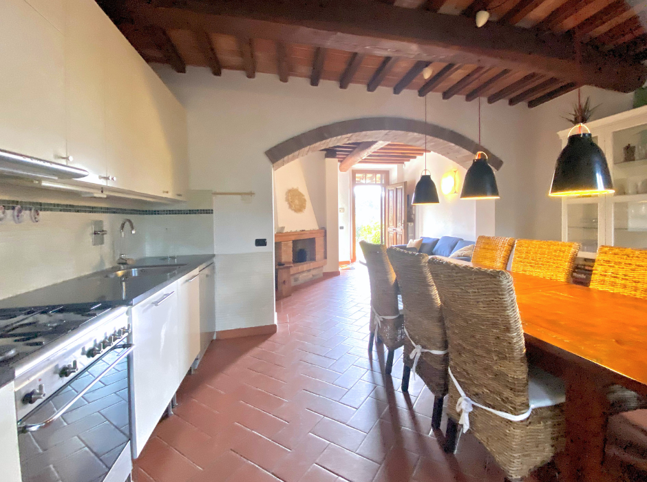 Beliggende i Toscanas smukke bakker tilbyder dette restaurerede rækkehus en betagende udsigt over det historiske Larciano Castello. Ejendommen, en del af en tidligere olivengård, forener autentisk italiensk charme med moderne komfort.